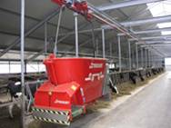 An automatic feedingsysteem feeds the cows by itself. It is a small feedingwagon wich is constructed under a rail in the barn. At the back of the barn is the kitchen who has to be filled by tractor or wheelloader. In the kitchen is room for several different feedingtypes. The machine feeds small portions of feed several times a day. This increases the fodder intake and the milkingproduction. It´s also possible to make different feedingrations. Than you can make different productiongroups and you can feed the drycows also a special ration.