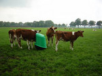 There are two types of a Automatic Feeding Systems for concentrates, one for a tied-up stable and one for a free walk stable. The biggest different is the time the cows can get concentrates. In a tied-up stable the box whit concentrates rolls over a rail in frond of the cows and every cow is known by a chip or a transponder and get her feed. In a free walking stable the cows can go to the feeding box when ever they want. They are also recognized by a chip or a transponder. It’s possible to feed more types of concentrates in one box. Some types can handle 4 to 5 types. So it’s very handy to make a perfect ration. Most of the times the feeding box is connect whit a computer. The computer can help the farmer to calculate how much the cows need.