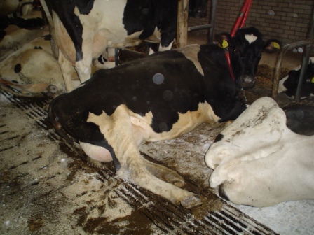 Cow is laying on the slatted floor